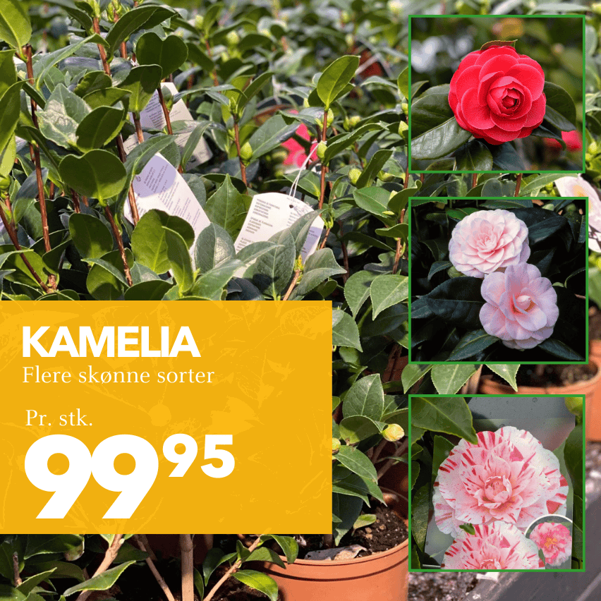 Nu har vi dem i centrene, de skønne Kamelia. Allerede nu står de med store knopper og begyndende blomst. Vælg mellem flere sorter.
