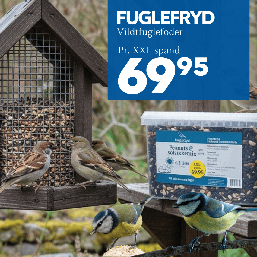 Fuglefryd er også navnet på vores foder til haven fugle. XXL spande til S pris. F.eks. 6,2 ltr. Peanuts & Solsikkemix eller 8,6 ltr. Solsikkefrø